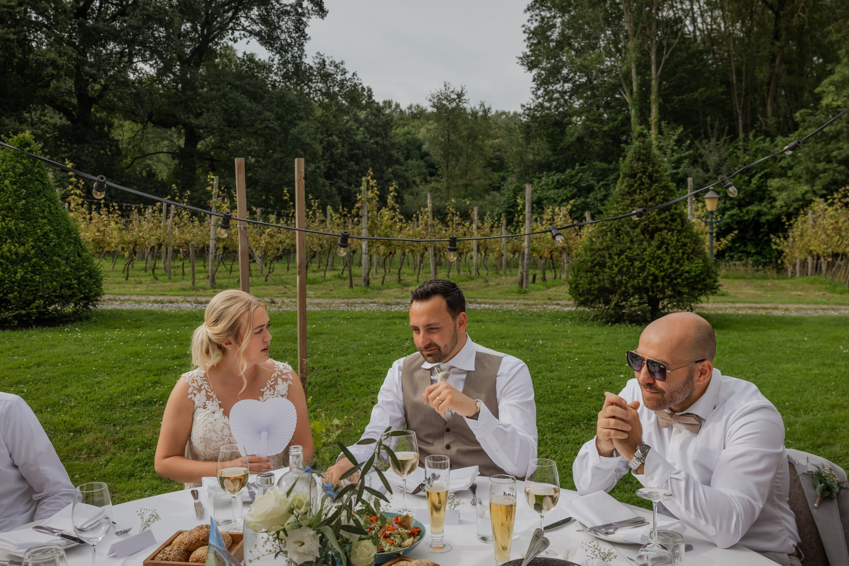 Na de ceremonie was het tijd voor het diner, dat plaatsvond op het ruime terras achter de Rome zaal. Hier konden de gasten niet alleen genieten van een heerlijke maaltijd, maar ook van het schilderachtige uitzicht op de wijngaarden en de groene omgeving van de Winselerhof. De ontspannen setting en de warme zomeravond in juli zorgden voor een gezellige en intieme sfeer, die de locatie zo uniek maakt.